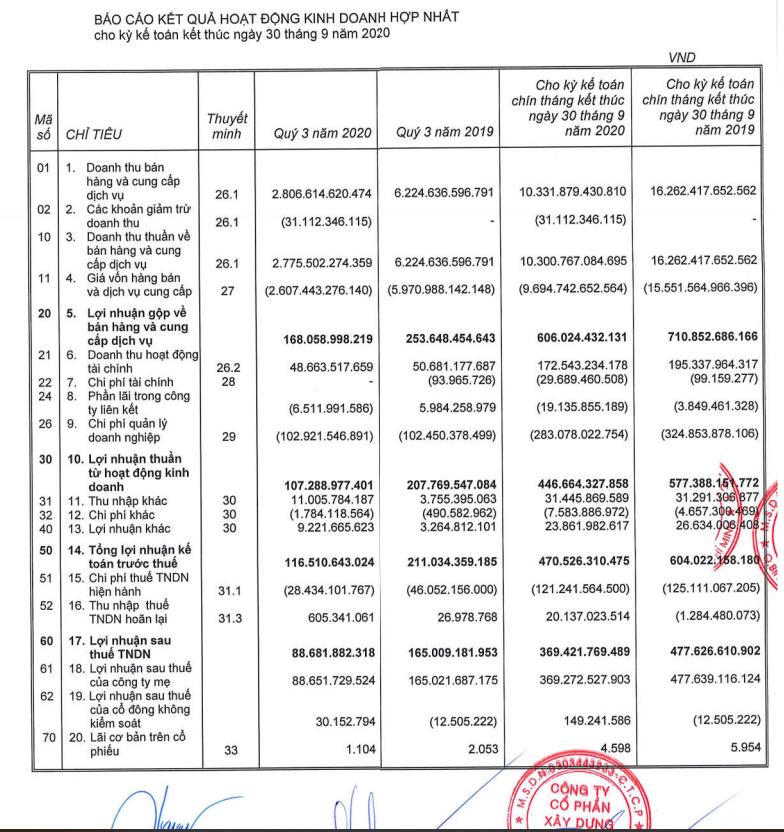 Báo cáo tài chính hợp nhất quý III/2020 cho thấy, doanh thu của CTD giảm mạnh từ 6.225 tỷ đồng xuống còn 2.807 tỷ đồng so với cùng kỳ 2019, lũy kế 9 tháng đầu năm cũng ghi nhận giảm xuống chỉ còn gần 10.332 tỷ đồng so với lũy kế 9 tháng năm ngoái.