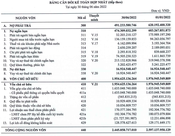 Một điểm sáng trong cấu trúc tài chính là nợ phải trả giảm mạnh 21% so với đầu năm về mức 491 tỷ đồng; trong đó phần lớn do vay nợ tài chính ngắn hạn giảm đáng kể 33% chỉ còn 215 tỷ đồng. Vốn chủ sở hữu đạt 1.955 tỷ đồng, chiếm đến 80% nguồn vốn.