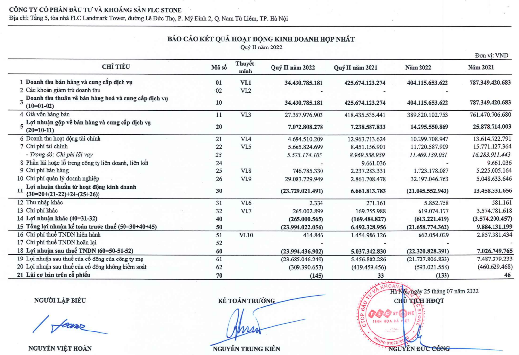 Tính lũy kế từ đầu năm, FLC Stone ghi nhận doanh số giảm phân nửa về mốc 404 tỷ đồng. Với sự suy giảm của quý vừa qua, đã kéo theo kết quả nửa đầu năm của FLC Stone lỗ sau thuế hơn 22 tỷ đồng.