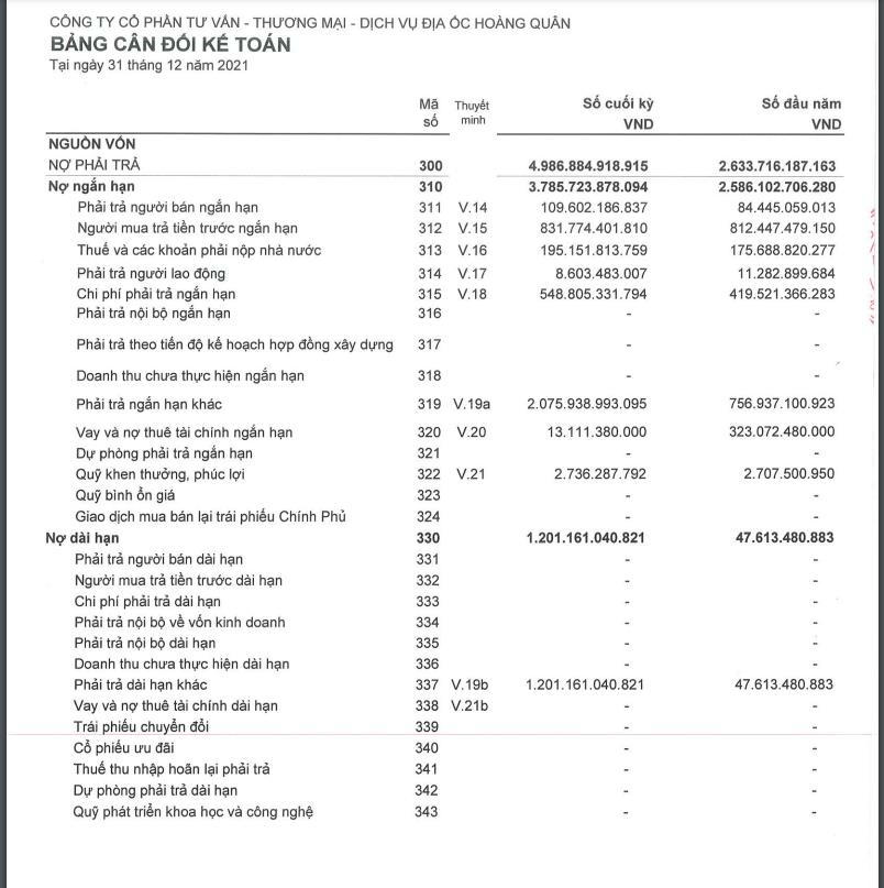 Về nợ phải trả, tổng nợ HQC ghi nhận hơn 4.986 tỷ đồng. Đặc biệt, dư nợ chủ yếu là từ các cá nhân liên quan, trong năm 2021 Công ty còn nợ Chủ tịch 1.110 tỷ đồng. Nợ ngắn hạn tại HQC là 3.786 tỷ đồng, tăng 45% so với con số đầu năm, vay dài hạn cũng đột biến lên 1.201 tỷ đồng.