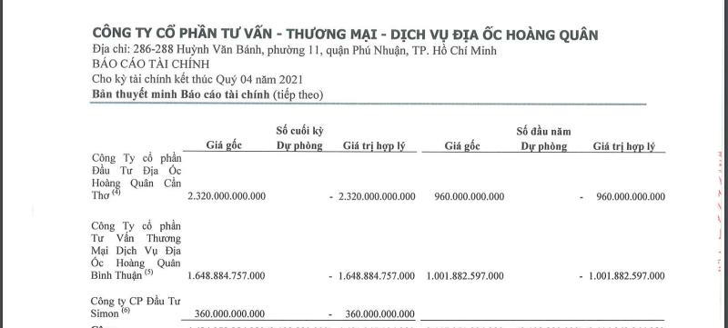 Năm 2021, Công ty đã hoàn thành việc mua và sở hữu 40% vốn điều lệ Công ty Simon, gia tăng vốn đầu tư tại Hoàng Quân Bình Thuận lên 44% vốn điều lệ; tăng sở hữu vốn tại Hoàng Quân Cần Thơ đến 39%. Trong đó, khoản đầu tư vào Hoàng Quân Cần Thơ là 2.320 tỷ đồng và Hoàng Quân Bình Thuận là 1.649 tỷ đồng và Simon là 360 tỷ đồng.