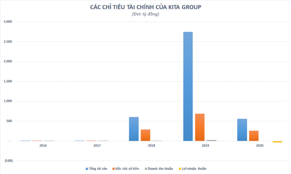Theo nguồn tin từ Vietnamindex cho biết, cuối năm 2019, tổng tài sản của Kita Group đã đạt hơn 2.700 tỷ đồng - gấp 4,5 lần so với thời điểm đầu năm. Vốn chủ sở hữu tăng mạnh từ 295,8 tỷ đồng lên 691,6 tỷ đồng. Năm 2020, không hiểu vì lý do gì mà quy mô của Kita Group lại bất ngờ “teo tóp” đáng kể; tổng tài sản “bốc hơi” 2.190 tỷ đồng (tương đương gần 80%) – từ hơn 2.700 tỷ đồng xuống còn 557 tỷ đồng. Doanh nghiệp cũng thực hiện giảm vốn điều lệ khiến vốn chủ sở hữu giảm 62% xuống mức 261 tỷ đồng.