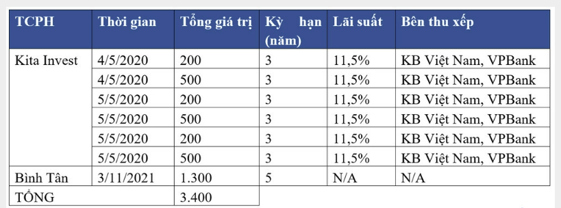 Thống kê từ Cbons cho thấy, các pháp nhân liên quan đến nhóm Kita Group là CTCP Kita Invest và CTCP Đầu tư Thương mại Bình Tân trong gần 2 năm qua đã huy động 3.400 tỷ đồng từ phát hành trái phiếu.