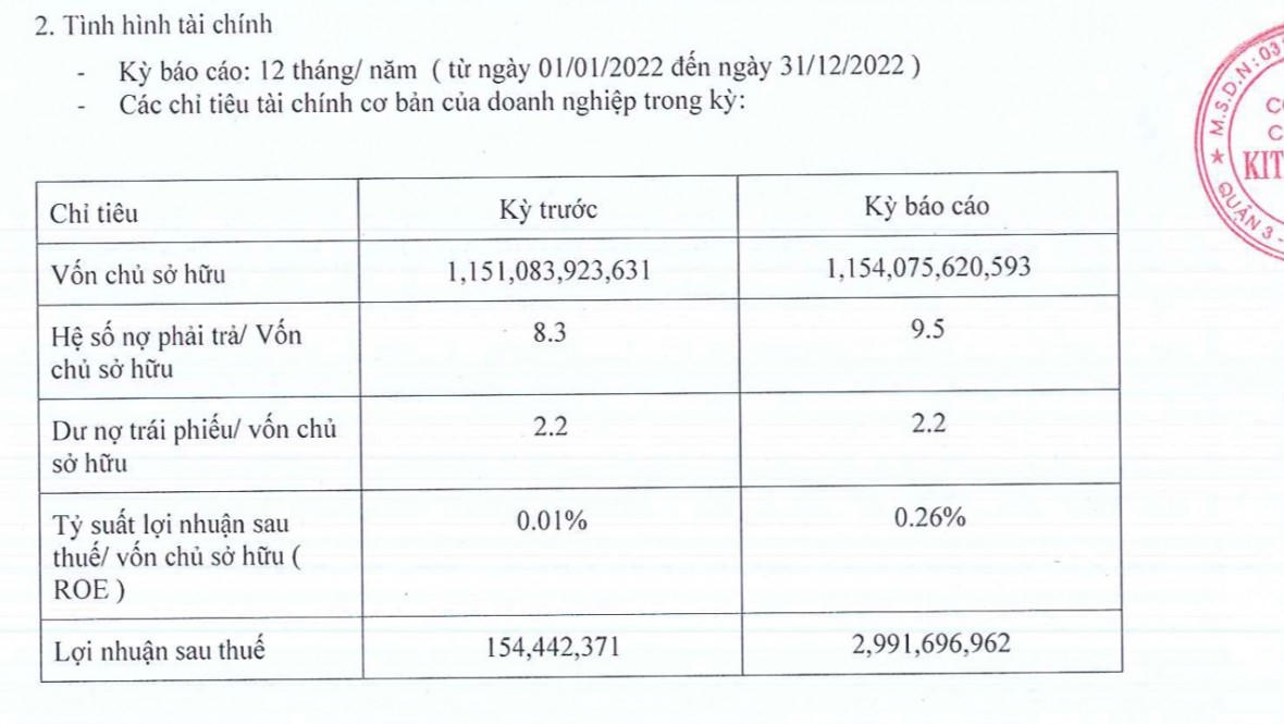 Theo đó, tính đến cuối năm 2022, Kita Invest đạt 2,9 tỷ đồng; tỷ suất lợi nhuận sau thuế cũng rất nhỏ, chỉ 0,26% mặc dù ghi nhận cao hơn so với kỳ trước (0,1%). Chỉ số dư nợ trái phiếu/vốn chủ sở hữu là 2,2% và hệ số nợ phải trả/vốn chủ sở hữu là 9.5%.