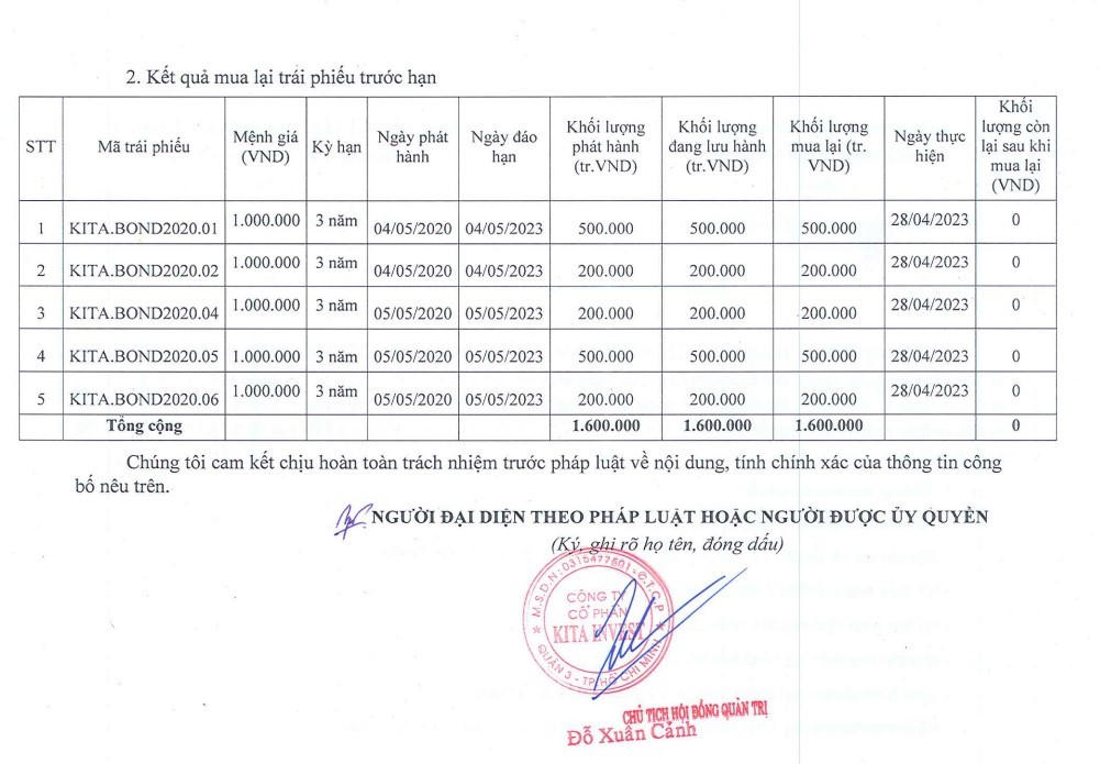 Ngày 28/4, CTCP Kita Invest đã chi 1.600 tỷ đồng để mua lại trước hạn toàn bộ trái phiếu đang lưu hành thuộc các lô KITA.BOND2020.01; KITA.BOND2020.02; KITA.BOND2020.04; KITA.BOND2020.05; KITA.BOND2020.06.