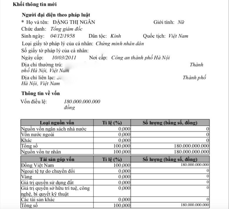 Vốn điều lệ của công ty là 80 tỷ đồng. Trong đó, bà Đặng Thị Ngân góp 60 tỷ đồng (chiếm tỷ lệ 75% vốn góp) và Khúc Thiên Hương góp 20 tỷ đồng (tỷ lệ 25%).