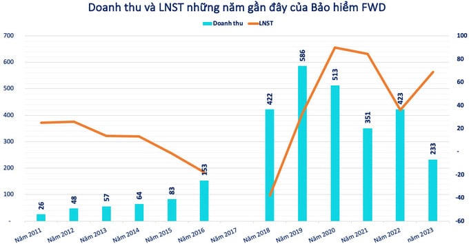 Xét về doanh thu, năm 2019 là "thời kỳ hoàng kim" khi doanh thu hoạt động kinh doanh bảo hiểm đạt 586 tỷ đồng, tăng trưởng 38,8% so với năm trước đó. Về lợi nhuận, FWD cũng có nhiều năm thua lỗ, trong đó năm 2018 lỗ xấp xỉ 38 tỷ đồng. Năm 2020 lãi lớn nhất với 90 tỷ đồng.