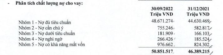 Ở một khía cạnh khác, nợ xấu trong 9 tháng đầu năm của ngân hàng này cũng bắt đầu tăng nhanh. Tổng nợ xấu tại ngày 30/09/2022 tăng 21% so với đầu năm, lên mức 1.425 tỷ đồng. Trong đó, nợ nghi ngờ tăng mạnh nhất tới 44% lên hơn 266 tỷ đồng, tiếp đến nợ có khả năng mất vốn tăng 18% lên hơn 976 tỷ đồng và nợ dưới tiêu chuẩn tăng 10% lên gần 182 tỷ đồng. Do đó, kéo tỷ lệ nợ xấu tại BVB tăng từ 2,53% hồi đầu năm lên 2,8%.