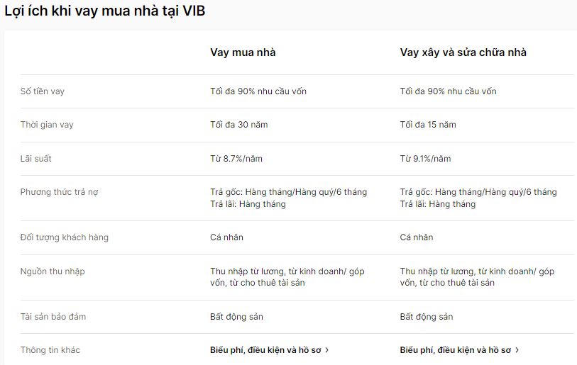 Đơn cử tại ngân hàng VIB, lãi suất cho vay mua nhà hiện đã tăng nhẹ 0,2%/năm từ mức 8,5%/năm lên 8,7%/năm dành cho khách hàng cá nhân, vay tối đa 90% nhu cầu vốn với thời gian vay lên tới 30 năm.