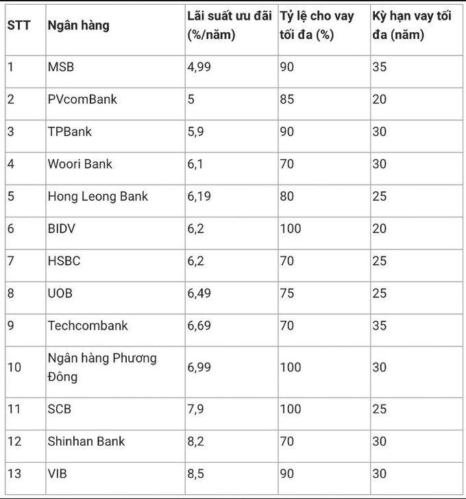 Khảo sát thực tế cho thấy, tại một số ngân hàng, lãi suất cho vay mua nhà thấp nhất hiện nay là từ 4,99%/năm, được áp dụng tại Ngân hàng TMCP Hàng hải Việt Nam (MSB). Tuy nhiên mức lãi suất này chỉ cố định trong 3 tháng đầu, đến tháng thứ 4 sẽ thả nổi theo lãi suất thị trường.