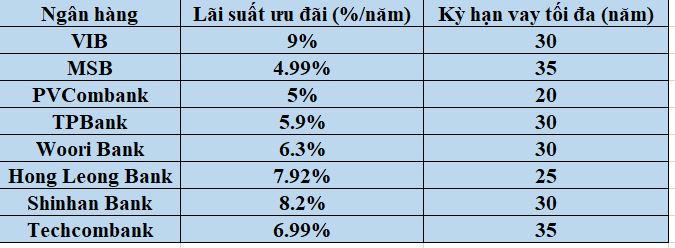 Ngân hàng BIDV có mức lãi suất 6,2%/năm khi vay mua nhà với thời hanh 20 -30 năm, còn ngân hàng Vieticmbank có lãi suất cho vay mua nhà là 7,7%/năm.