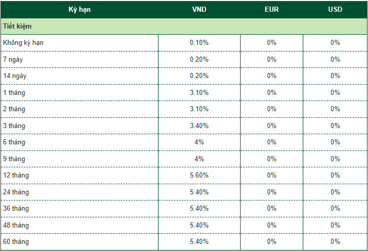 Đáng chú ý, ''ông lớn'' Vietcombank cũng chính thức gia nhập cuộc đua tăng lãi suất. Sau Agribank và BIDV, kỳ này Vietcombank cũng góp mặt vào danh sách ngân hàng quốc doanh tăng lãi suất. Lãi suất tiền gửi kỳ hạn 1 tháng tăng 0.1 điểm phần trăm lên 3.1%/năm, kỳ hạn 3 tháng tăng lên mức 3.4%/năm và 12 tháng lên mức 5.6%/năm.