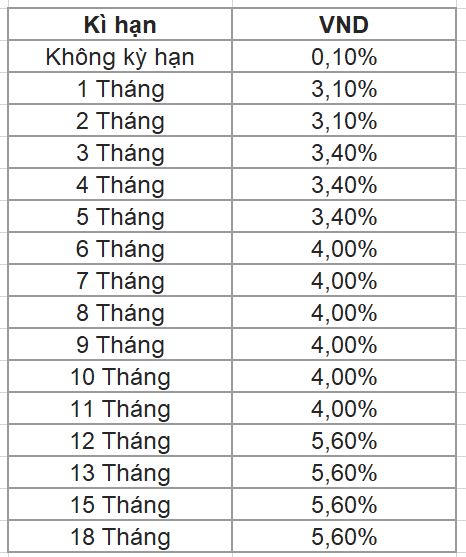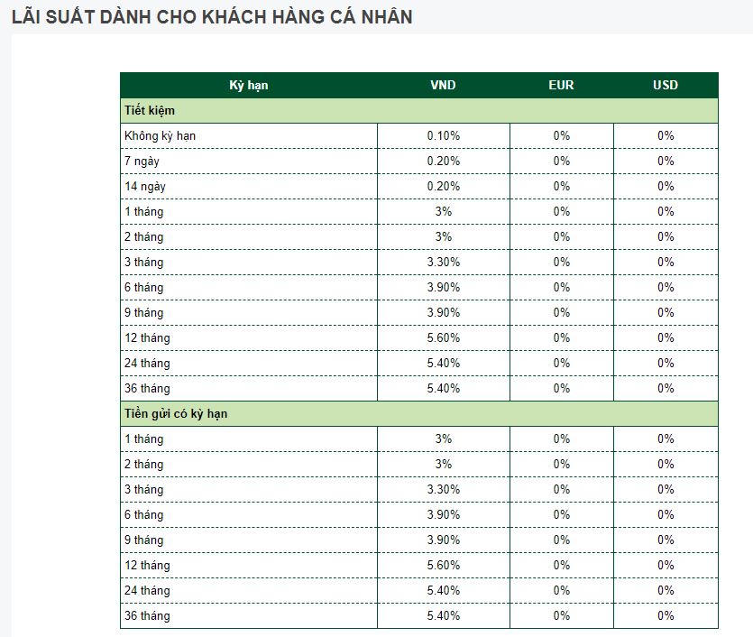 Đối với khách hàng cá nhân, lãi suất tiết kiệm và lãi suất tiền gửi có kỳ hạn giao động trong khoảng từ 3%/năm đến 5,6%/năm. Khung lãi suất này triển khai cho các khoản tiền gửi tại kỳ hạn từ 1 tháng đến 36 tháng lĩnh lãi cuối kỳ. So sánh với tháng trước, lãi suất giảm 0,1 - 0,3 điểm % tại nhiều kỳ hạn.