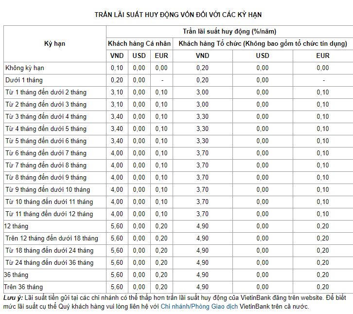 Tương tự như BIDV, lãi suất tiền gửi tháng 1/2021 tại Vietinbank cũng được giữ nguyên so với tháng 12/2020. Đối với khách hàng cá nhân cũng dao động từ 3,1%- 5,6%/năm. Đối với khách hàng tổ chức dao động từ 3% - 4,9%/năm.