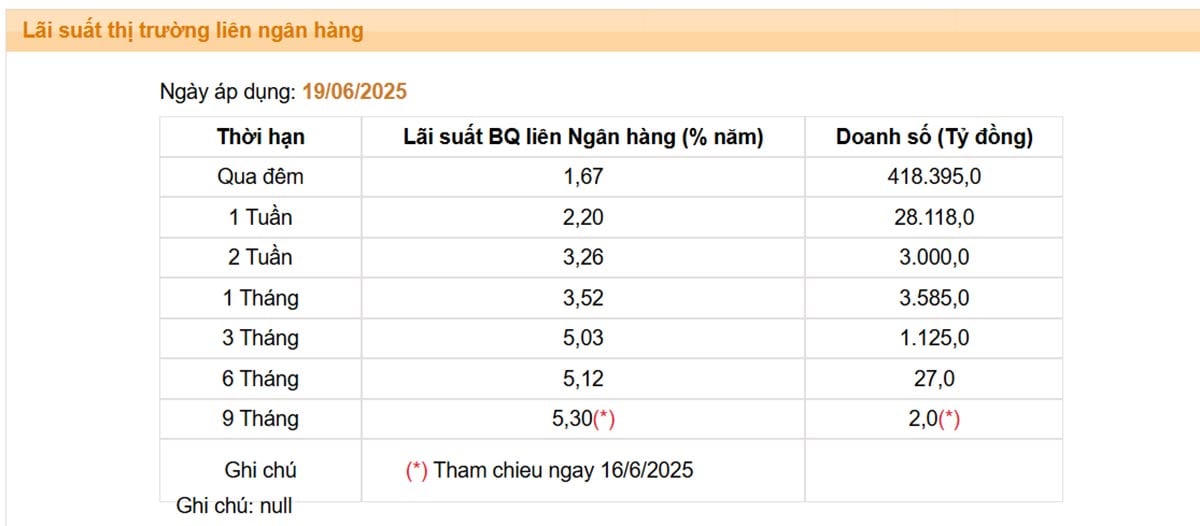 Lãi suất liên ngân hàng kỳ hạn qua đêm tại phiên đầu tuần (16/6) được niêm yết ở mốc 3,13% và giảm dần qua các phiên xuống 1,67%/năm tại ngày 19/6, thấp nhất kể từ tháng 3/2024 đến nay.