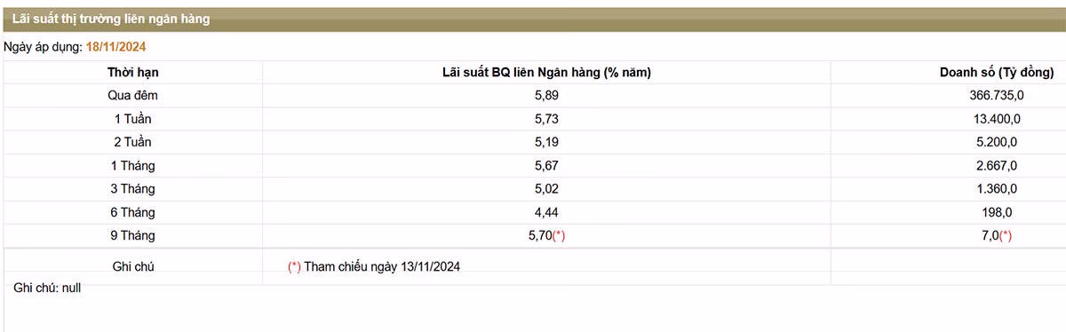 Vào ngày 4/11, lãi suất các kỳ hạn qua đêm và một tuần lần lượt ở mức 6,08%/năm, 6,12%/năm, lập kỷ lục trong vòng gần 2 năm trở lại đây.