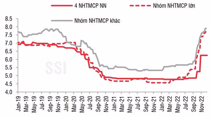 Trên thực tế, dưới áp lực về thanh khoản, mặt bằng lãi suất huy động ở thị trường 1 cũng tăng nhanh chóng, với kỳ hạn từ 6 tháng đến dưới 12 tháng đa số dao động ở mức từ 8,5 - 10%/năm cho các ngân hàng thương mại cổ phần, tăng khoảng 4 - 5 điểm phần trăm so với cuối năm 2021.