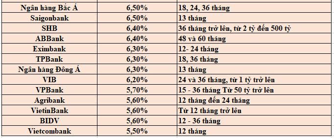 Cụ thể, lãi suất huy động cao nhất tại Vietcombank hiện là 5,5%/năm tại kỳ hạn 12 tháng. Lãi suất huy động tại BIDV, Vietinbank, Agribank cao nhất đều là 5,6%/năm. Trong đó, Vietinbank áp dụng cho khách hàng gửi tiết kiệm tại kỳ hạn từ 12 tháng trở lên; Agribank áp dụng tại kỳ hạn từ 12 tháng đến 24 tháng còn tại BIDV áp dụng kỳ hạn từ 12 tháng đến 36 tháng.
