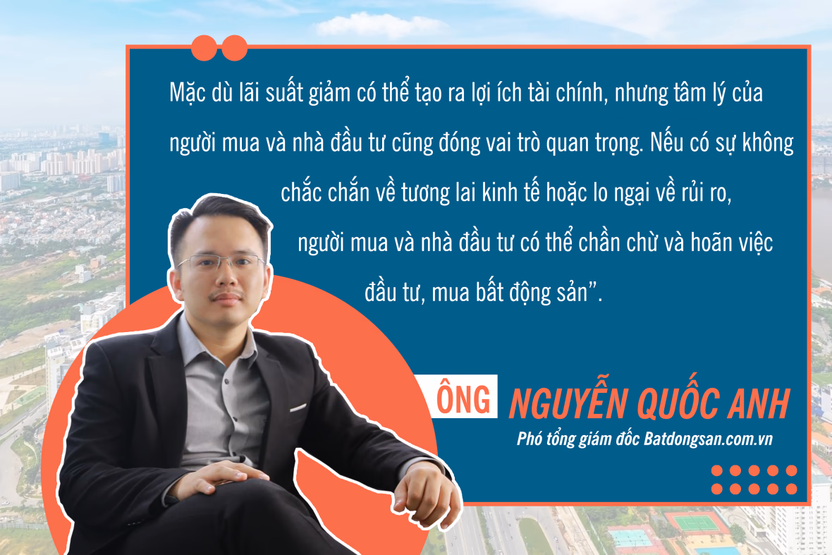 Theo ông Nguyễn Quốc Anh, Phó Tổng giám đốc Batdongsan.com.vn, việc Ngân hàng Nhà nước hạ lãi suất sẽ giúp giảm chi phí vay, nhà đầu tư nhờ đó tạo tâm lý và động lực của người mua và nhà đầu tư.