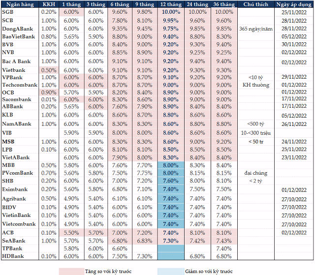 Đến ngày 07/12, mức lãi suất tiền gửi tiết kiệm 1-3 tháng được nâng lên trong khoảng 4.9-6%/năm, kỳ hạn 6-9 tháng nằm trong khoảng 6-9.8%/năm, kỳ hạn 12 tháng trong khoảng 7.3-10%/năm.