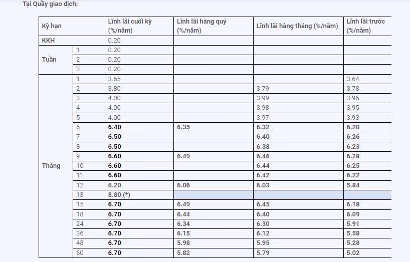 Riêng tại ngân hàng Vietcombank, phạm vi lãi suất tuy ở cùng trong khoảng 3,1%/năm đến 5,6%/năm như các “ông lớn” khác nhưng lãi suất tiền gửi áp dụng ở từng kỳ hạn có ít nhiều khác biệt. Mức lãi suất ngân hàng cao nhất tại Vietcombank là 5,6%/năm chỉ áp dụng tại kỳ hạn 12 tháng. Còn tại các kỳ hạn gửi khác khách hàng sẽ được nhận mức lãi thấp hơn.