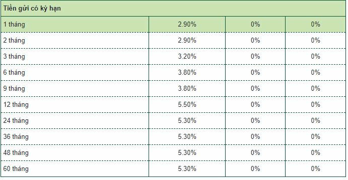 Đồng thời, Vietcombank cũng giảm đồng loạt 0,1 điểm % lãi suất tại tất cả các kỳ hạn từ 1 tháng đến 36 tháng. Biểu lãi suất tiền gửi dành cho khách hàng cá nhân ghi nhận được nằm trong phạm vi từ 2,9%/năm đến 5,5%/năm. Tiền gửi tiết kiệm tại kỳ hạn 12 tháng đang có lãi suất cao nhất, niêm yết ở mức 5,5%/năm.