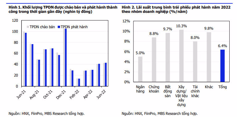 Cụ thể, MBS nhận định, Lãi suất bình quân gia quyền của những trái phiếu bất động sản phát hành trong 6 tháng đầu năm 2022 là 9,7%/năm, tăng 1,8 điểm phần trăm so với năm 2021 trong khi kỳ hạn bình quân là 2,45 năm.