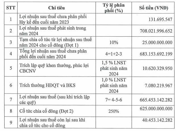 Tổng giá trị cổ tức tiền mặt lên tới 650 tỷ đồng – cao gấp gần 2,5 lần vốn điều lệ hiện hành của công ty (250 tỷ đồng).