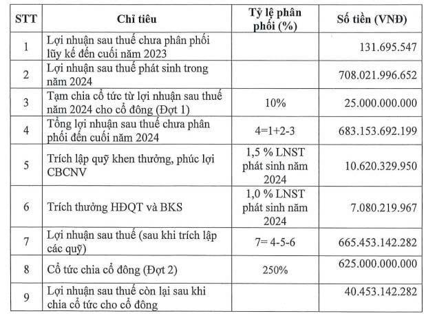 Theo kế hoạch, cổ tức sẽ được thanh toán thành 2 đợt: đợt đầu 10%, tương ứng 25 tỷ đồng và đợt còn lại 250%, tương đương 625 tỷ đồng. Thời gian chi trả dự kiến diễn ra trong tháng 11 tới.