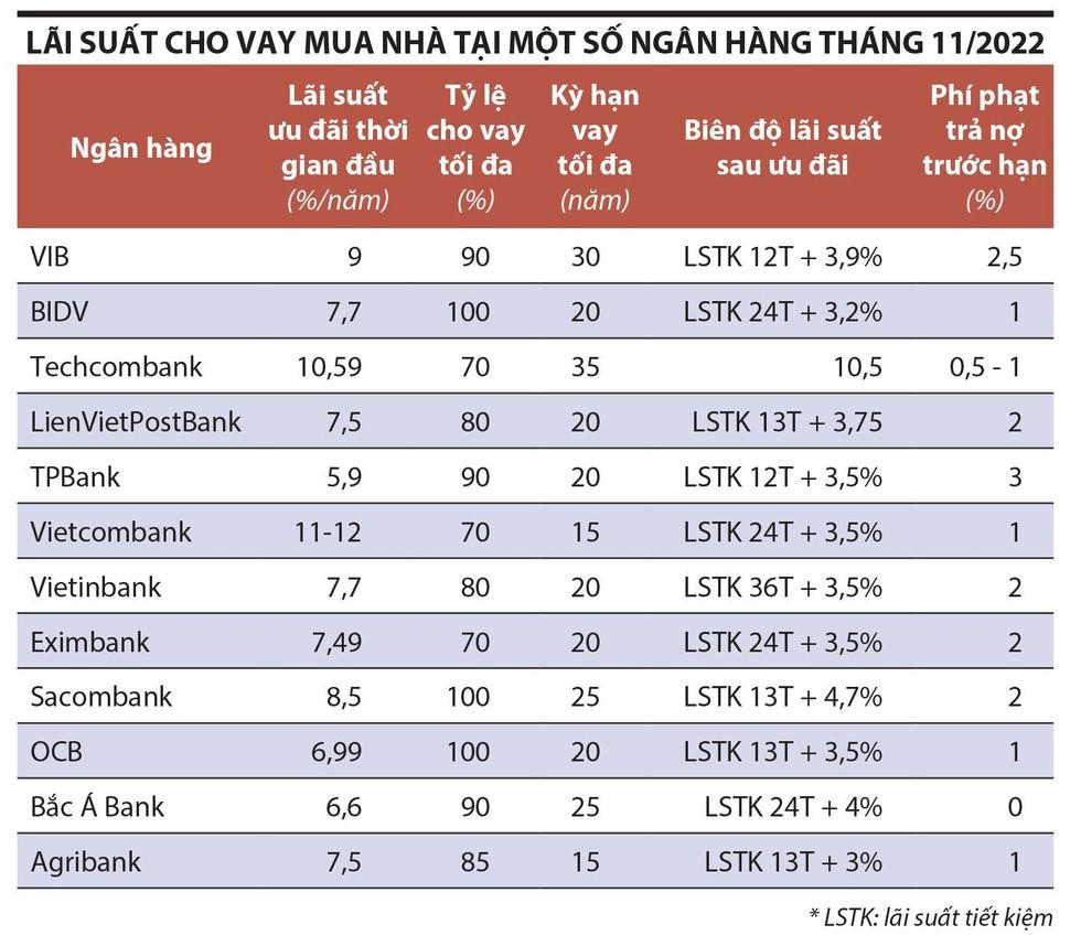 Lãi suất vay mua nhà của Ngân hàng Thương mại Cổ phần Phương Đông (OCB) trong tháng 11 năm nay đang là 15%/năm, cố định trong năm đầu tiên, biên độ dao động là 4,4%. Sau 1 năm ưu đãi, lãi suất sẽ tăng lên là 16,4%/năm, tuy vậy, người vay vẫn phải xếp hàng chờ giải ngân bởi OCB đã hết hạn mức tín dụng. Ngoài ra, để tránh trường hợp người vay tất toán trước hạn hay chuyển sang ngân hàng có lãi suất thấp hơn, OCB quy định mức lãi suất thực khi tất toán trước hạn trong năm đầu tiên là 19,91%. Như vậy, mức lãi suất của OCB đã tăng thêm từ 4-5%/năm so với đầu năm 2022. Ngân hàng TMCP Ngoại thương Việt Nam (Vietcombank) hiện đang áp dụng lãi vay mua nhà ở mức 11-12%/năm tùy gói vay, thời hạn và đối tượng khách hàng.