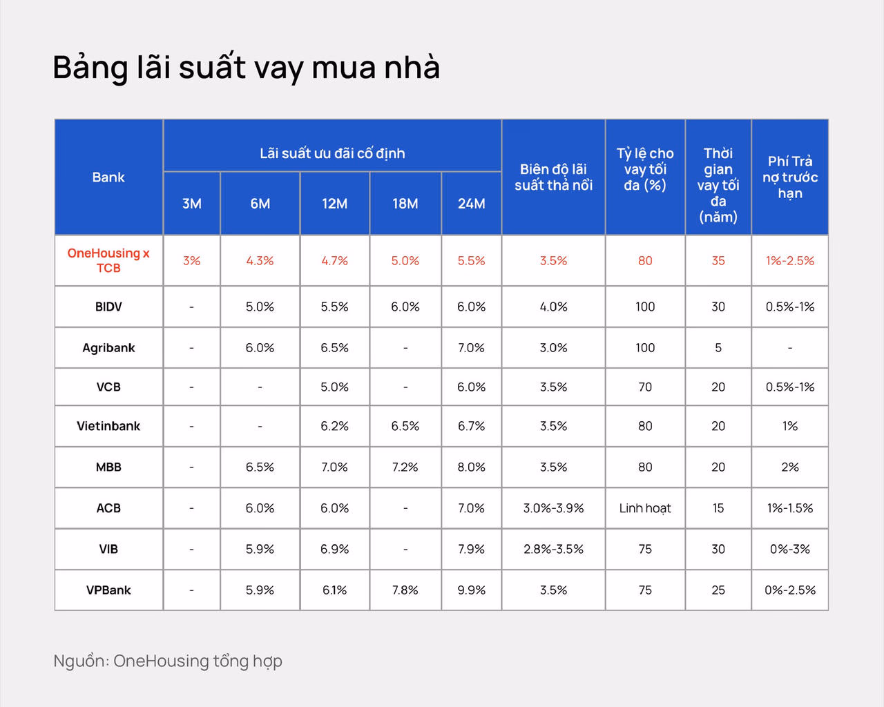 Đáng chú ý, Techcombank và OneHousing kết hợp với nhau cho ra mắt giải pháp vay mua nhà chuyển nhượng với lãi suất cố định hấp dẫn nhất thị trường chỉ từ 3%/năm. Khách hàng chỉ cần thanh toán từ 20%, thời hạn cho vay tới 35 năm. Đây được xem là mức lãi vay mua nhà thấp nhất thị trường hiện nay.
