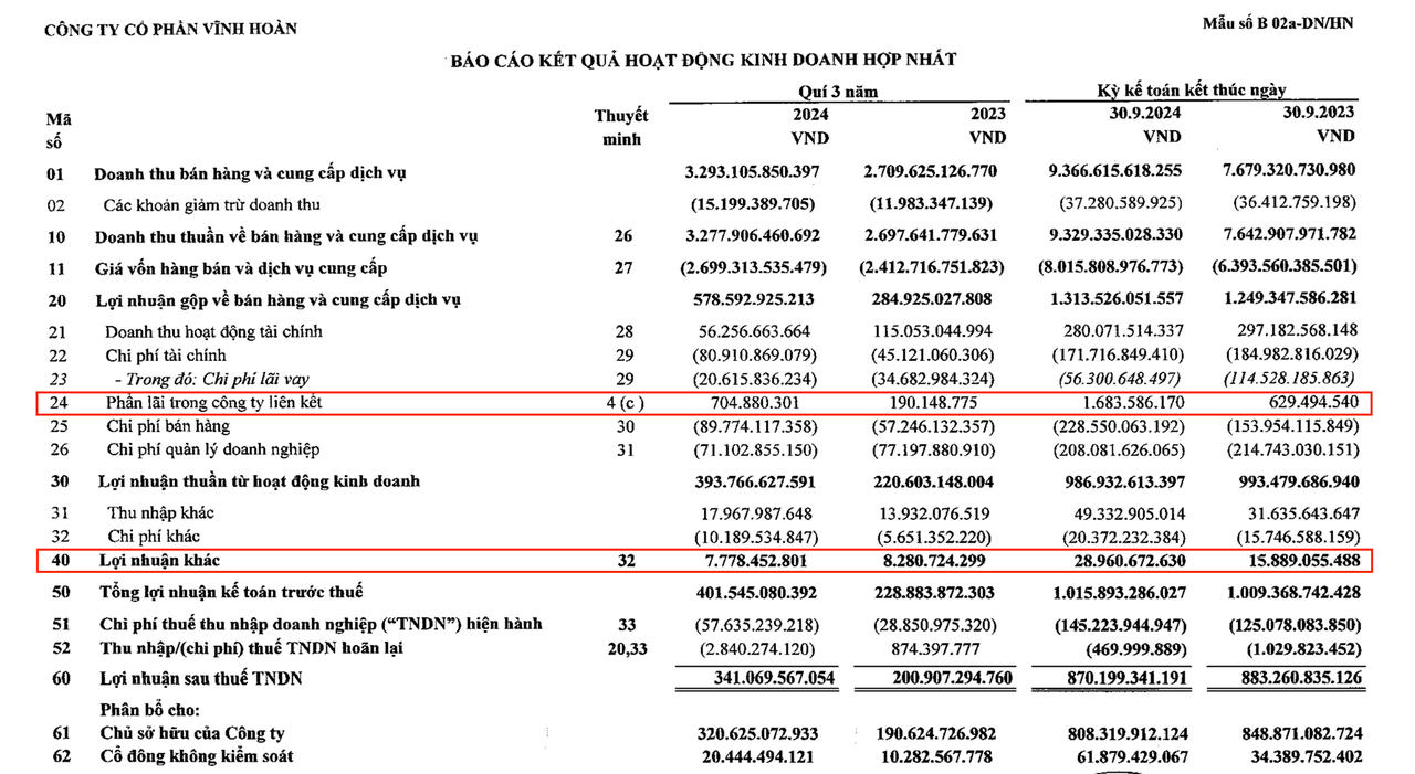 Luỹ kế 9 tháng đầu năm, doanh thu của Vĩnh Hoàn đạt 9.329 tỷ đồng, tăng 22% so với cùng kỳ. Dù vậy, do áp lực chi phí, lợi nhuận sau thuế của doanh nghiệp vẫn giảm nhẹ 1,5%, đạt hơn 870 tỷ đồng. Lợi nhuận sau thuế cổ đông công ty mẹ tương ứng đạt 808 tỷ đồng.