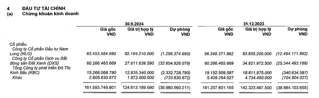 Đáng chú ý, Vĩnh Hoàn vẫn đang phải ôm “trái đắng” vì “vung tiền” đầu tư “cổ đất”. Tại ngày 30/9/2024, doanh nghiệp ghi nhận khoản chứng khoán kinh doanh trị giá gần 162 tỷ đồng và phải trích lập dự phòng 37 tỷ đồng, tương ứng tạm lỗ gần 23% tổng danh mục đầu tư.