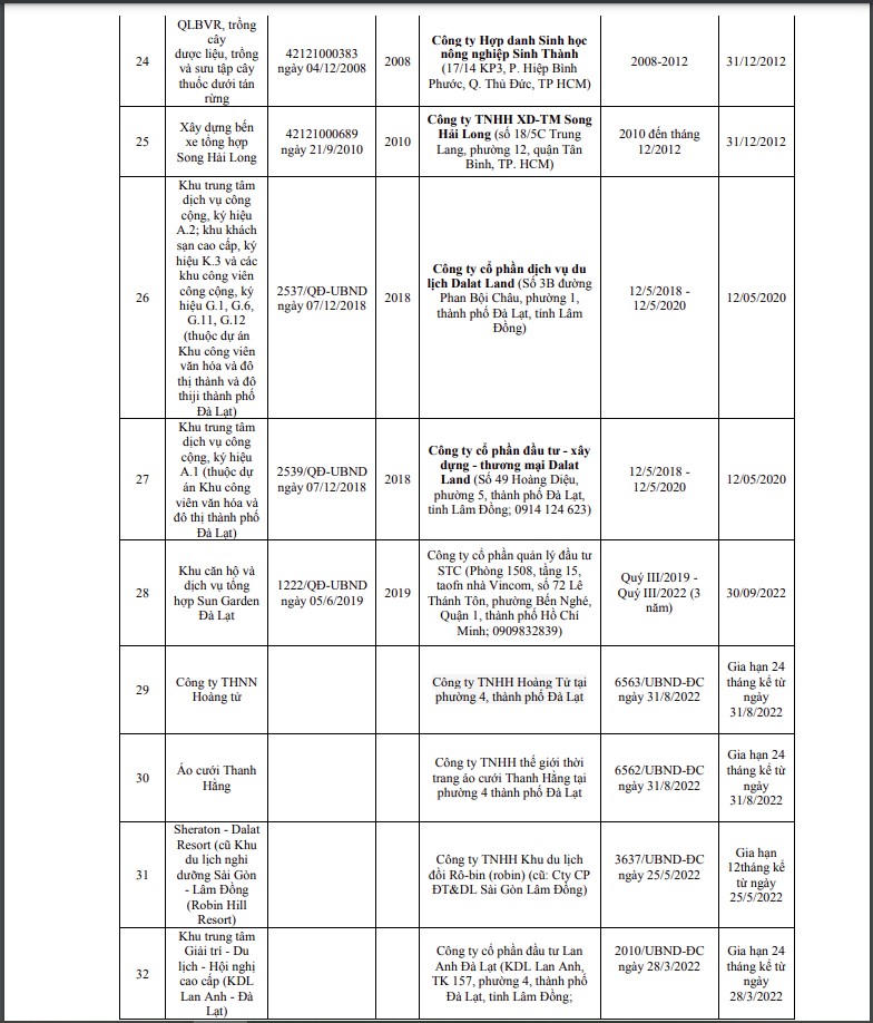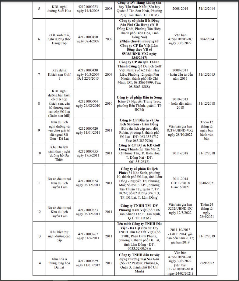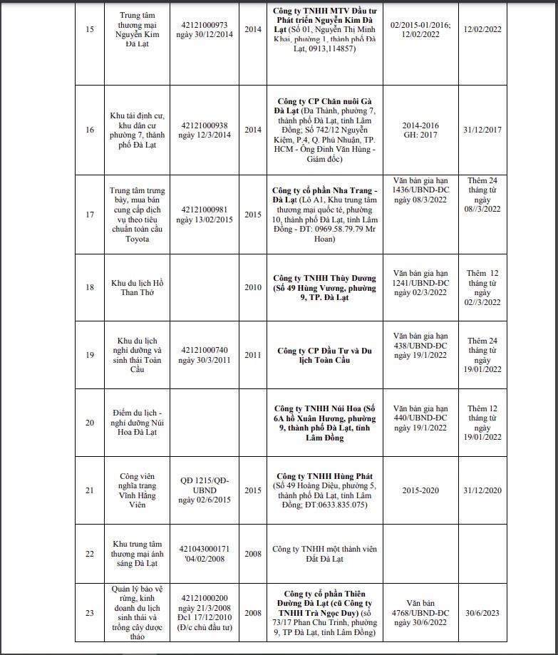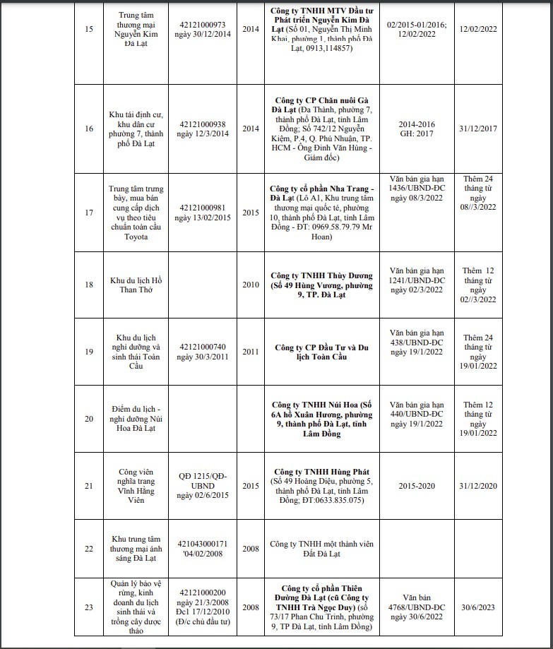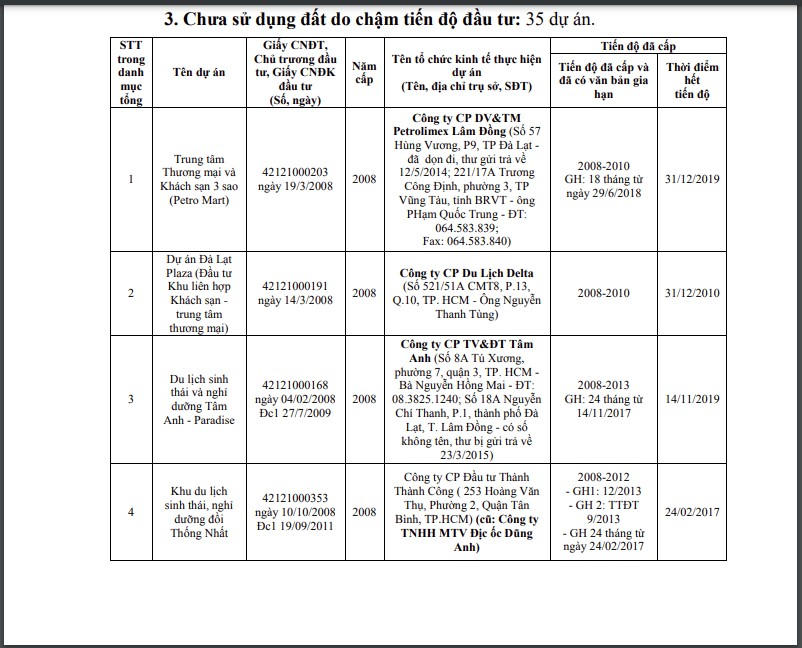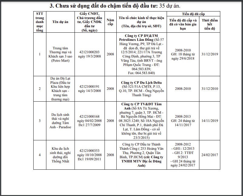Trong số 35 dự án được TP Đà Lạt nêu tên vì chậm tiến độ có một số dự án đáng chú ý như: 2 dự án do CTCP Đầu tư Thành Thành Công (thuộc TTC Group) làm chủ đầu tư là dự án Khu du lịch sinh thái, nghỉ dưỡng đồi Thống Nhất và dự án xây dựng khách sạn golf1 ; Khu du lịch nghỉ dưỡng và vui chơi giải trí dã ngoại Sài Gòn - Đà Lạt của CTCP Đầu tư và Du lịch Sài Gòn - Lâm Đồng; hai dự án của CTCP dịch vụ du lịch Dalat Land gồm Khu trung tâm dịch vụ công cộng, khu khách sạn cao cấp và các khu công viên công cộng;