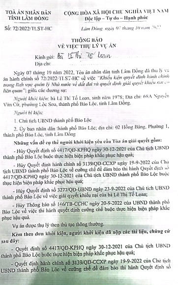 “Nhận thấy việc UBND TP Bảo Lộc ra quyết định số 435/QĐ-UBND không đúng quy định pháp luật, nên ngày 01/3/2023 tôi có làm đơn khiếu nại quyết định số 435/QĐ-UBND của Chủ tịch UBND TP Bảo Lộc gửi đến Tòa án Nhân dân tỉnh Lâm Đồng. Đến nay, Tòa án Nhân dân tỉnh Lâm Đồng đã ban hành thông báo 69/TB-TLBSVA ngày 07/3/2023 về việc thụ lý bổ sung yêu cầu khởi kiện vụ án hành chính sơ thẩm”, chị Loan chia sẻ.