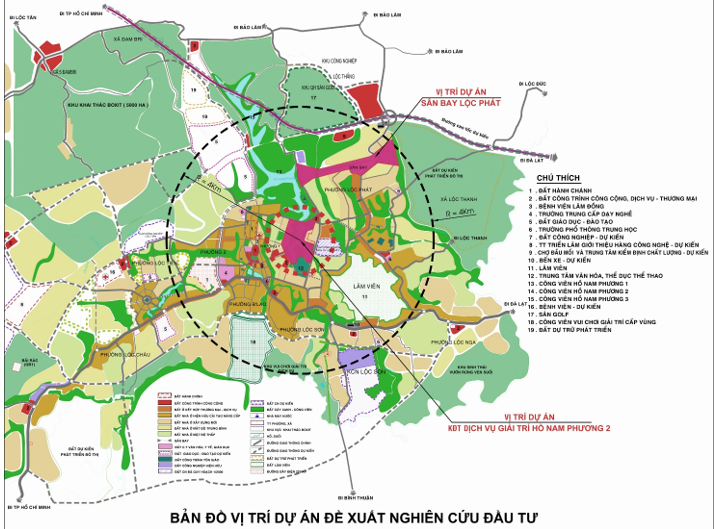 Vị trí Dự án Sân bay Lộc Phát và Dự án Khu đô thị, dịch vụ giải trí Hồ Nam Phương 2, doanh nghiệp đề xuất đầu tư tại TP. Bảo Lộc.