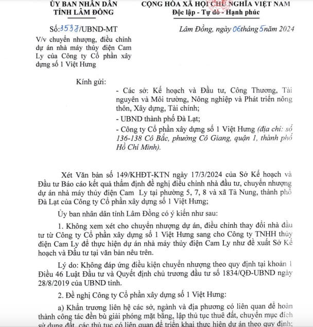 UBND tỉnh Lâm Đồng vừa có văn bản không xem xét cho chuyển nhượng dự án, điều chỉnh thay đổi nhà đầu tư từ Công ty cổ phần Xây dựng số 1 Việt Hưng sang cho Công ty TNHH Thủy điện Cam Ly, để thực hiện dự án Nhà máy thủy điện Cam Ly như đề xuất Sở Kế hoạch và Đầu tư tỉnh này.