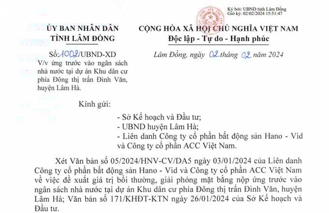 Đầu tháng 2 vừa qua, UBND tỉnh Lâm Đồng đã có quyết định về việc không chấp thuận đề xuất gia hạn thời gian ứng tiền bồi thường, tái định cư tại dự án khu dân cư phía Đông thị trấn Đinh Văn, huyện Lâm Hà của liên danh CTCP Bất động sản Hano - Vid và CTCP ACC Việt Nam.