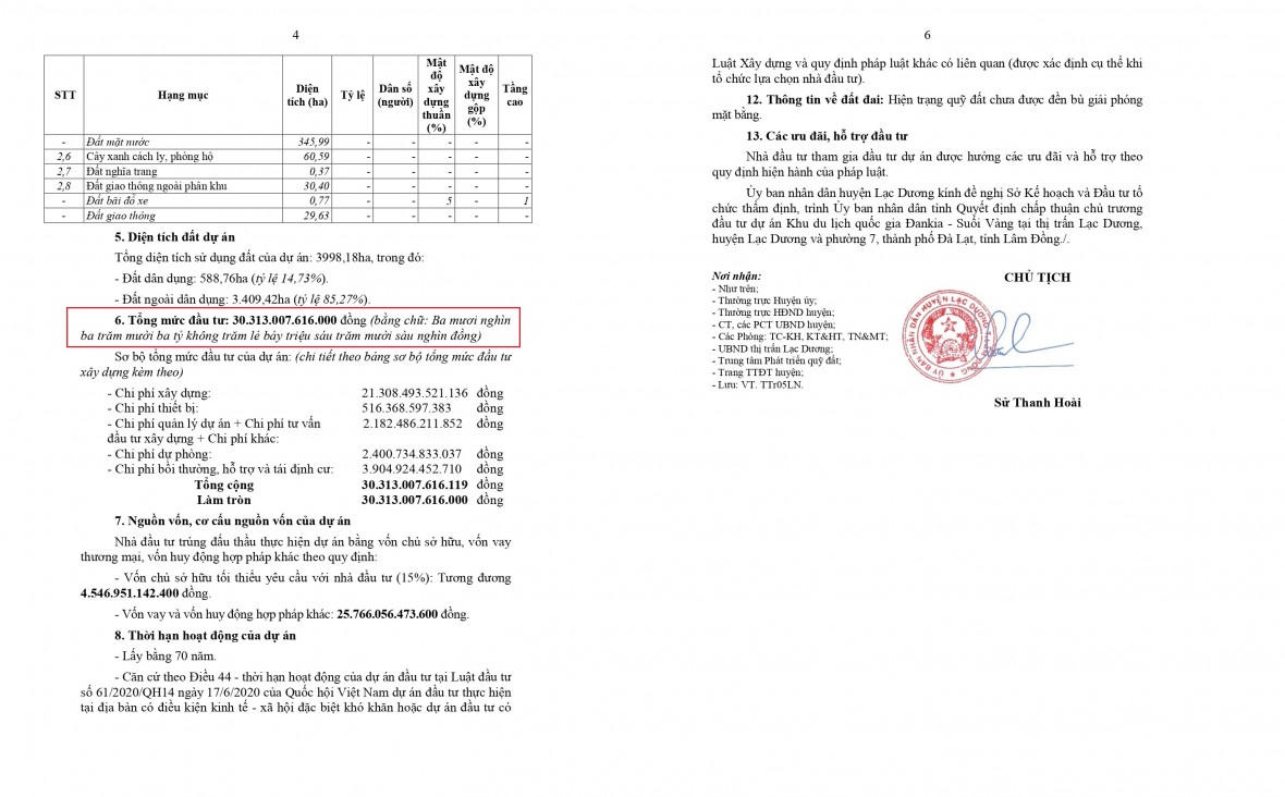 Dự án Khu du lịch quốc gia Đankia - suối Vàng có tổng mức đầu tư 30.313 tỷ đồng. Trong đó, vốn chủ sở hữu tối thiểu yêu cầu với nhà đầu tư tương đương 4.547 tỷ đồng; vốn vay và vốn huy động hợp pháp khác khoảng 25.766 tỷ đồng.