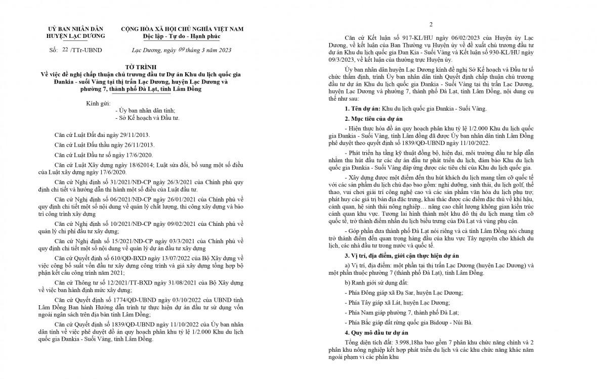 UBND huyện Lạc Dương vừa có Tờ trình gửi đến UBND tỉnh Lâm Đồng đề nghị chấp thuận chủ trương đầu tư Dự án Khu du lịch quốc gia Đankia - suối Vàng với quy mô vốn đầu tư lên đến 30.313 tỷ đồng.