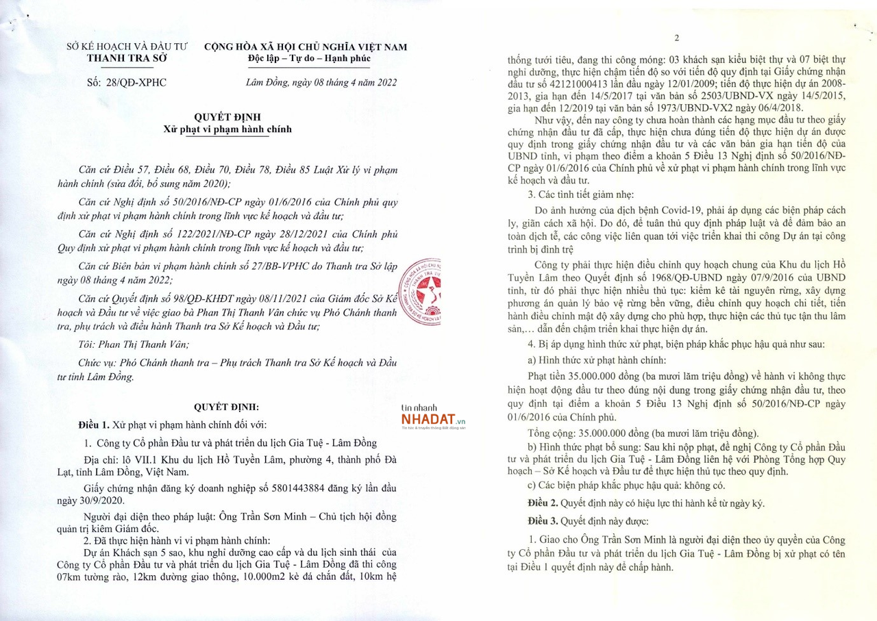 Ngay sau đó, ngày 8/4, Thanh tra Sở đã xử phạt 35 triệu đồng đối với CTCP Đầu tư và Phát triển Du lịch Gia Tuệ – Lâm Đồng – chủ đầu tư của dự án khách sạn 5 sao, khu nghỉ dưỡng cao cấp và du lịch sinh thái nằm trong khu du lịch Hồ Tuyền Lâm.