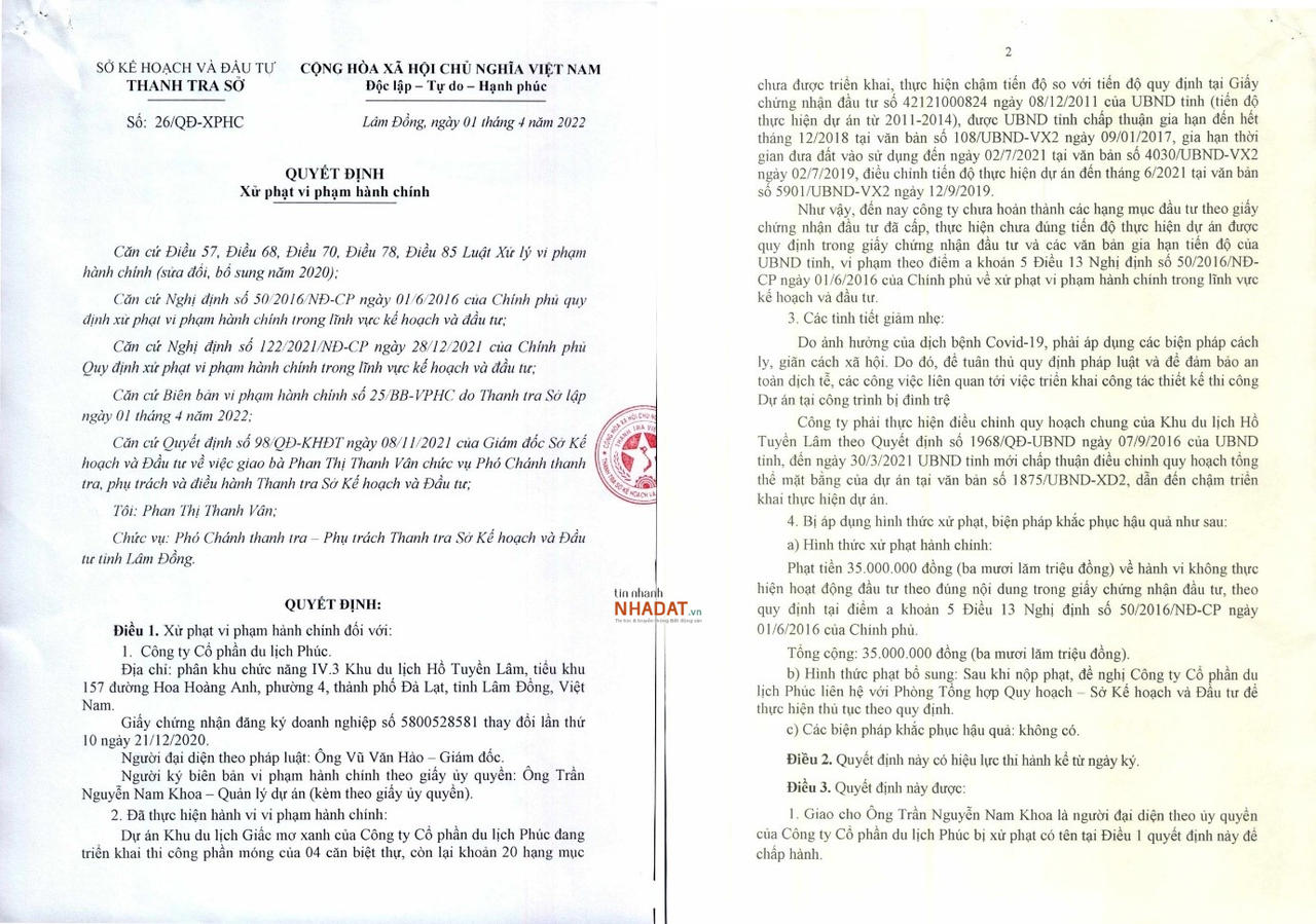 Trong khi đó, vào ngày 1/4/2022, Thanh tra Sở Kế hoạch và Đầu tư tỉnh Lâm đồng cũng đã ban hành quyết định 26/QĐ-XPHC đối với CTCP Du lịch Phúc – chủ đầu tư của Khu du lịch Giấc Mơ Xanh. Dự án này đang triển khai thi công phần móng của 4 biệt thự, còn lại khoảng 20 hạng mục chưa được triển khai, chậm tiến độ so với quy định.