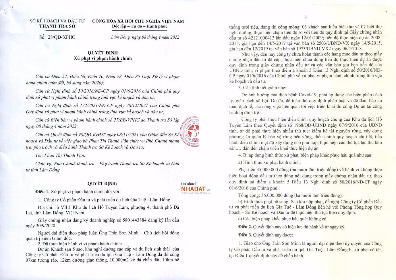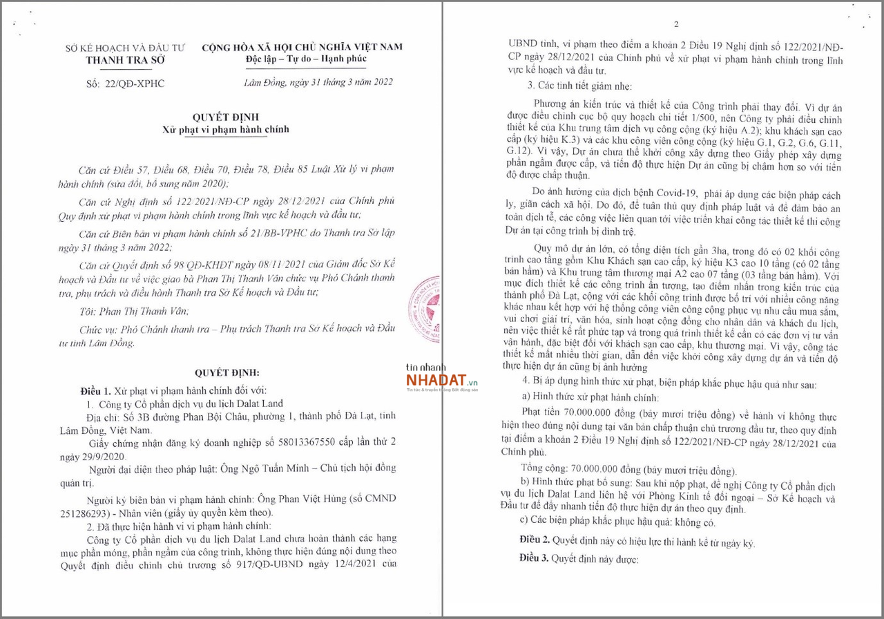 Cụ thể, Thanh tra Sở Kế hoạch và Đầu tư tỉnh Lâm đồng đã ban hành quyết định 22/QĐ-XPHC đối với CTCP Dịch vụ Du lịch Dalat Land do chưa hoàn thành các hạng mục phần móng, phần ngầm của công trình, không thực hiện đúng nội dung theo Quyết định điều chỉnh chủ trương số 917/QĐ-UBND ngày 12/4/2021 của UBND tỉnh, vi phạm theo điểm a khoản 2 Điều 19 Nghị định số 122/2021/NĐ-CP ngày 28/12/2021 của Chính phủ về xử phạt vi phạm hành chính trong lĩnh vực kế hoạch và đầu tư.