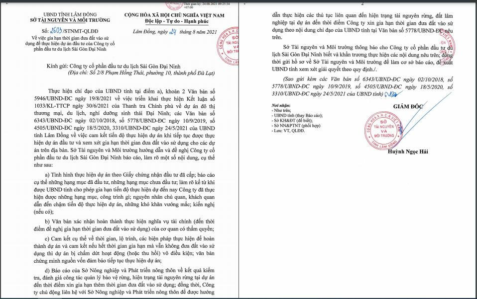 Sở Tài nguyên và Môi trường (TN&MT) tỉnh Lâm Đồng vừa có văn bản gửi Công ty Cổ phần đầu tư du lịch Sài Gòn Đại Ninh (Công ty Sài Gòn Đại Ninh) liên quan đến việc gia hạn thời gian đưa đất vào sử dụng để thực hiện dự án đầu tư của công ty.
