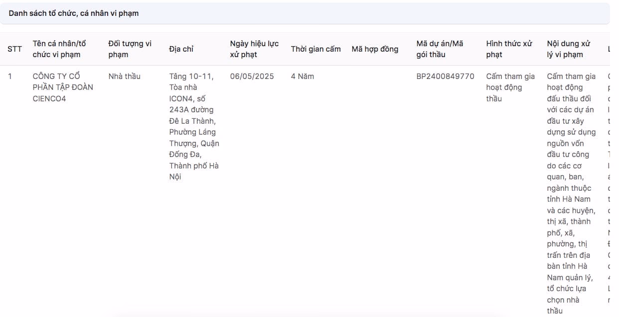 UBND tỉnh Hà Nam có quyết định cấm thầu 4 năm đối với CTCP Tập đoàn CIENCO4, sau khi phát hiện doanh nghiệp này làm giả tài liệu trong hồ sơ dự thầu.