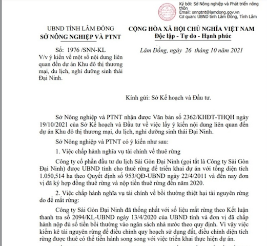 Liên quan đến việc dự án Khu đô thị thương mại, du lịch, nghỉ dưỡng, sinh thái Đại Ninh do Công ty Sài Gòn - Đại Ninh làm chủ đầu tư bị cơ quan chức năng tỉnh Lâm Đồng “gọi tên” vì làm mất 257ha đất rừng. Mới đây, Sở NN&PTNT tỉnh Lâm Đồng đã có văn bản gửi Sở KH&ĐT liên quan số tiền mà doanh nghiệp này phải bồi thường theo quy định.