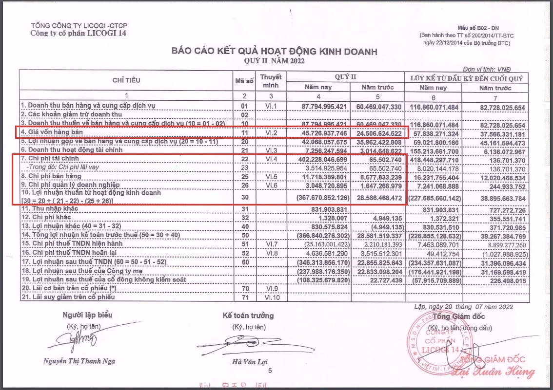Tại CTCP Licogi 14 (L14) chi phí, giá vốn hàng bán tăng cao là nguyên nhân khiến L14 báo lỗ 366,84 tỷ đồng trong quý 2/2022 (trong khi cùng kỳ năm trước lãi 28,58 tỷ đồng), bất chấp doanh thu thuần về bán hàng và cung cấp dịch vụ trong kỳ đạt 87,8 tỷ đồng, tăng 45% so với cùng kỳ năm 2021.