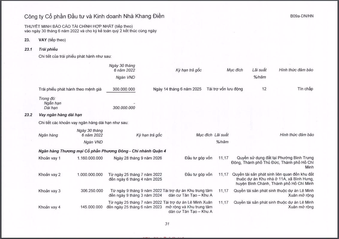 Trong khoản nợ phải trả của KDH có tới 72% là nợ tài chính (5.763 tỷ đồng), trong đó chủ yếu là các khoản vay tín dụng từ ngân hàng.