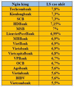 Tính đến đầu tháng 7/2022, lãi suất tiền gửi tiết kiệm cao nhất ở mức 7,8%/năm thuộc về ngân hàng Techcombank với điều kiện tiền gửi từ 999 tỷ đồng trở lên, kỳ hạn gửi là 12 tháng. Như vậy, Techcombank đã điều chỉnh tăng mạnh tới 0,7 điểm% lãi suất từ 7,1%/năm lên mức 7,8%/năm.