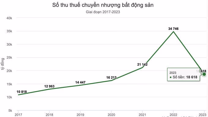 Sau đó 4 năm (năm 2022), số tiền thu thuế từ chuyển nhượng BĐS tăng 64%, lên 34.700 tỷ đồng - mức cao nhất trong 6 năm.